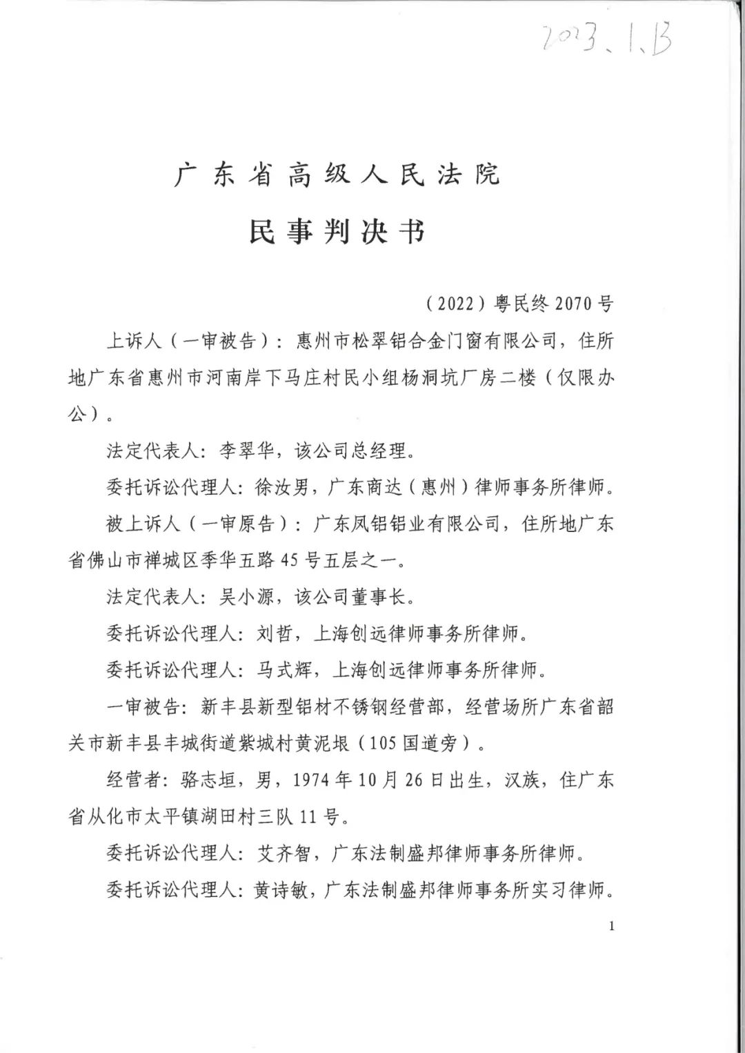 广东省高级人民法院驳回上诉,维持原判!松翠公司赔偿我方当事人凤铝公司经济损失及合理维权费用共100万元;新丰经营部赔偿凤铝公司经济损失及合理维权费用共5万元;普诺德公司赔偿凤铝公司经济损失及合理维权费用共50万元;辉煌公司凤铝公司经济损失及合理维权费用共100万元。